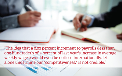 The idea that a 0.02 percent increment to payrolls (less than one hundredeth of a percent of last year's increase in average weekly wages) would even be noticed internationally, let alone undermine our "competitiveness," is not credible. Worse yet, this argument misunderstands the nature of competitiveness in a modern, innovation-driven economy. Cementing a reputation as a safe, high-quality, inclusive place to live is beneficial to national competitiveness, and paid leave for victims of domestic violence would be an important symbol of Australia's commitment in that regard.
